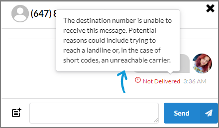 If the message fails to reach the receiving party, a Not Delivered status will be displayed under the text. When you hover over the error message, a tooltip appears, providing details about the reason for the delivery failure.