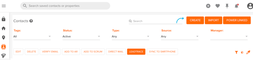 Realeflow Users can add new contacts to their CRM by accessing Dashboard > Contacts and selecting one of those options from the upper right: Create, Import or Power Linked. You can also create new Contacts / Properties from Properties. More information regarding the action of creating contacts can be provided by your CRM representatives.