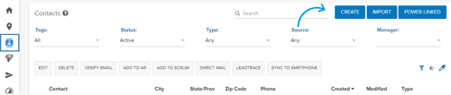 REI Software CRMs Users can add new contacts to their CRM by accessing Dashboard > Contacts and selecting one of those options from the upper right: Create, Import or Power Linked. More information regarding the action of creating contacts can be provided by your CRM representatives. You can also create new Contacts / Properties from Properties.