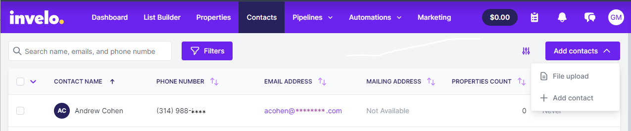 You have the option to add singular contacts or to upload and map a file with contacts.