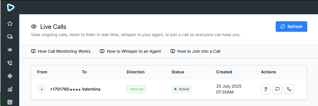 To Whisper into a call, you need granted permission and access to the Call Monitoring tab on your Admin Dashboard. Once there, you'll immediately see Live Calls: