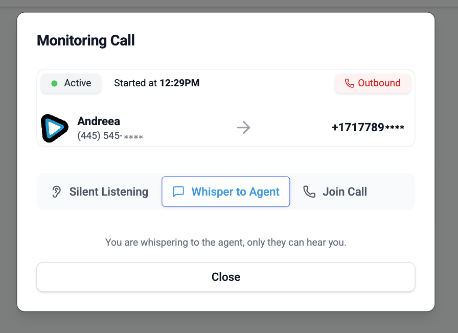 By using the Whisper feature, a User can talk with an agent without being heard by the other person on the line. This is ideal for helping out with extra info, or coaching during training.