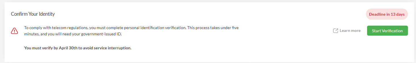 As of May 1, 2024, all smrtPhone Account Owners need verify their identity, or their account(s) may be paused, halting all inbound and outbound communication.