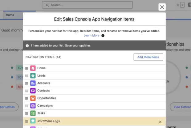 Next to the Home button, you expand the menu and click Edit. In the Edit Sales Console App Navigation Items, you need to add more items. Look for smrtPhone Logs and add them to your list of items. You can edit also the Sales App Navigation Items in the same way.
