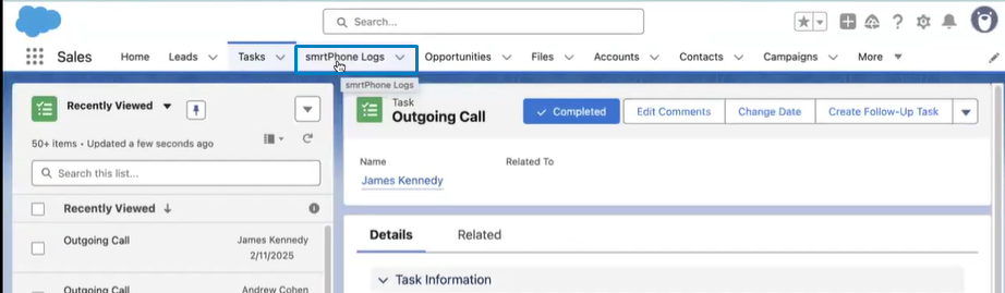 smrtPhone Call Logs and Recordings can be viewed from Salesforce Tasks