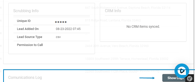 Communications Log - The communications associated with this particular lead, such as previous phone calls or text messages. You can see in this window the last 20 communications logs associated with this lead for a quick view.