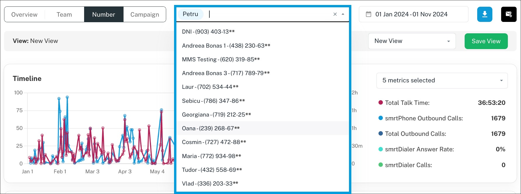 Check particular number (numbers) performances by selecting them in the filter up on the tab. Then pick the metrics that you want to follow from the drop-down menu. The metrics available are the same as the ones in Timeline.