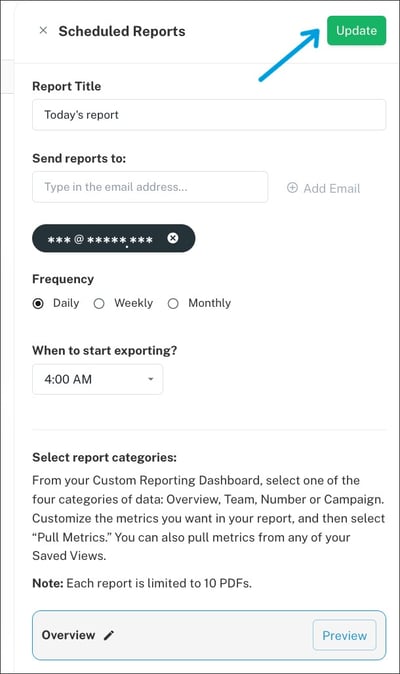 In the same section, Reports, where you see all of your reports, you can edit or delete scheduled reports. Click on the report's name and see the overview of your scheduled reporting and also edit details. Once edits are made, hit Update to save them.
