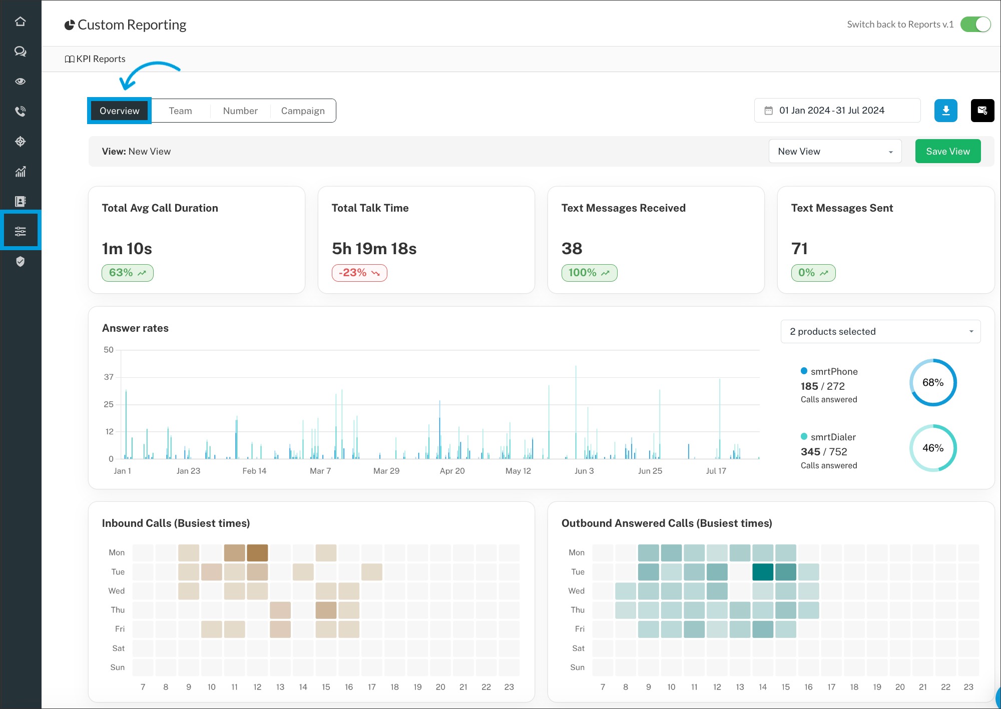Also, you can see separate reports for smrtPhone and smrtDialer and pick from different metrics available for the 4 report tabs.