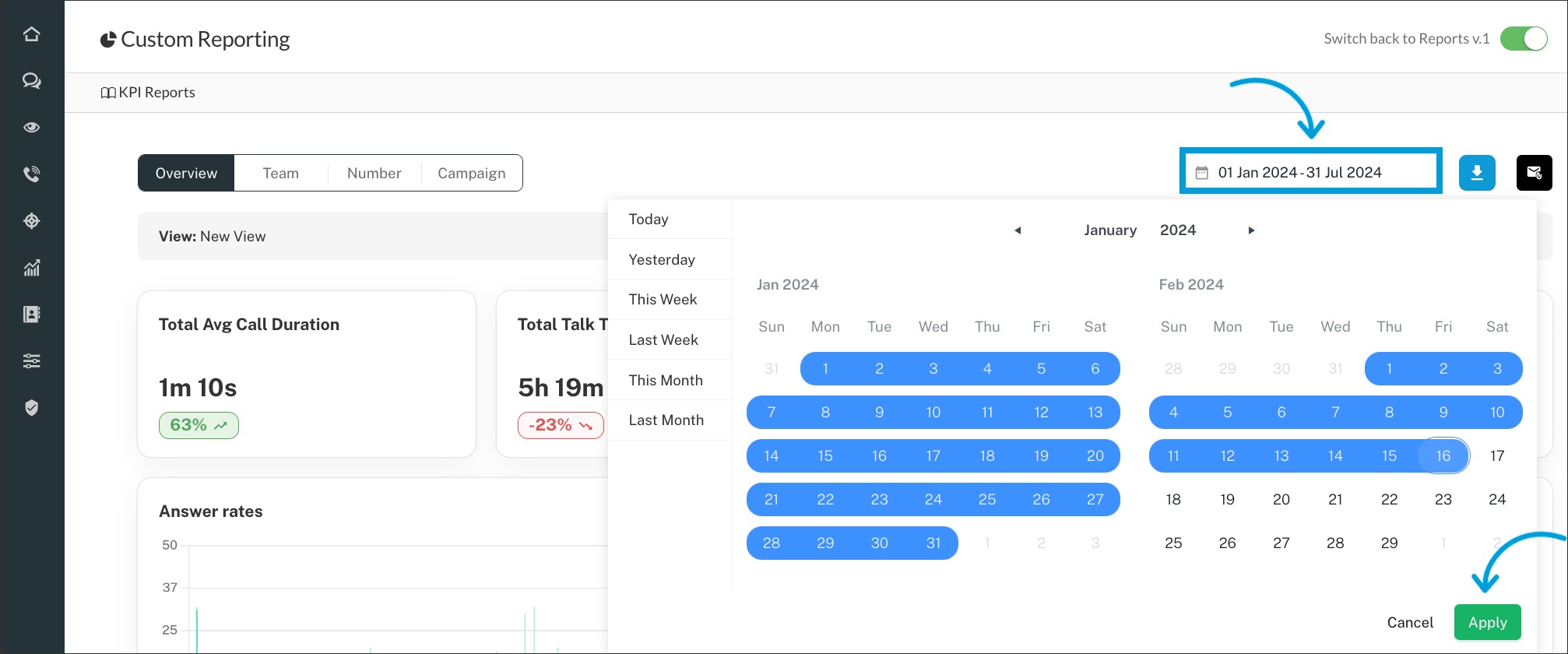 Use the calendar icon at the top of all reports to select the period you'd like to analyze.