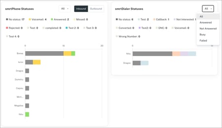 At the bottom of the dashboard, the 2 graphs show both smrtPhone (inbound or outbound) and smrtDialer Call Statuses (only outbound) for the users you selected above in the previously set timeframe.