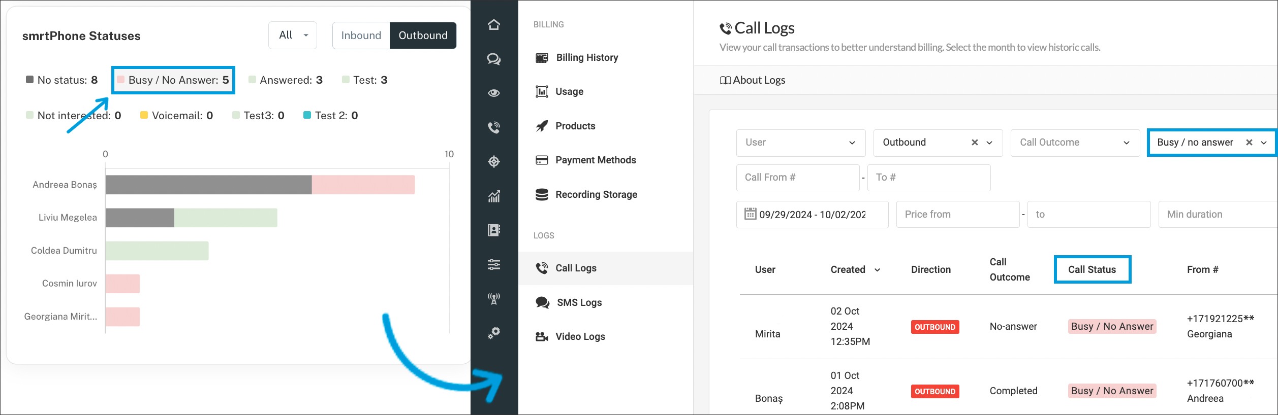 This newly opened smrtPhone logs tab will have the call status filter already set, being exactly the one you just clicked in the reporting section. You can change filters or export the results as they are.