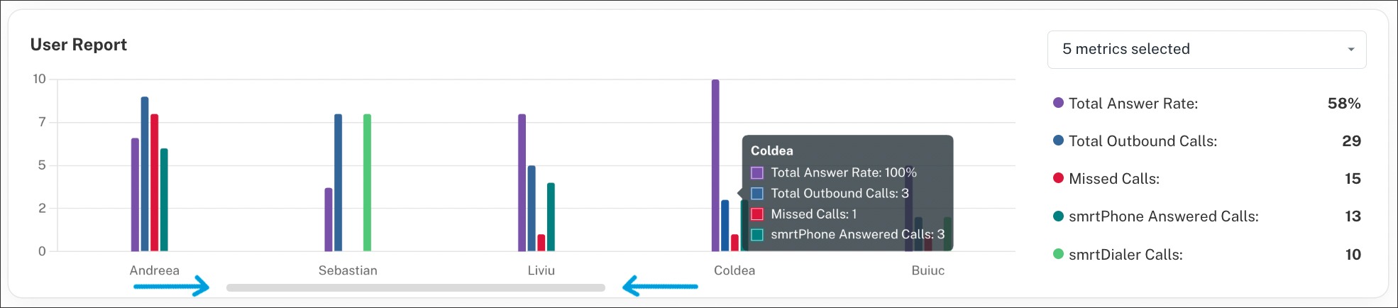 For the User Report, you can also use 5 metrics of your choice from the same list and see the data split by user names according to what you selected above.