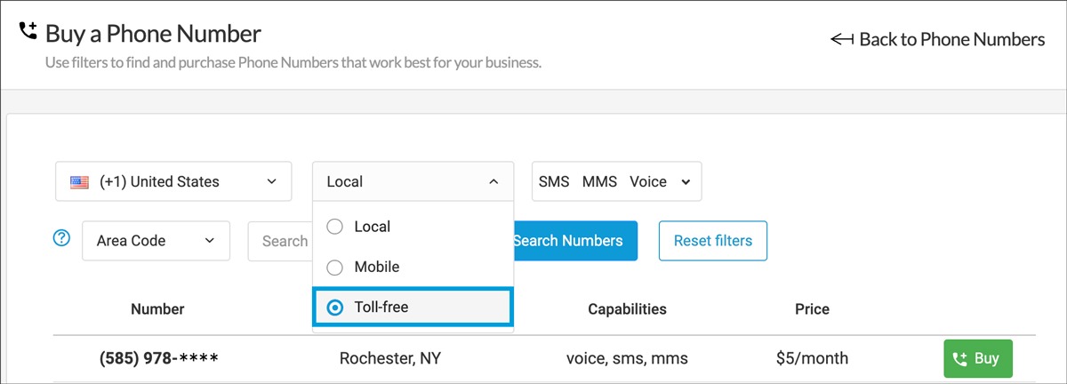 You can easily buy a Toll-Free number by accessing Admin Dashboard > Phone Numbers and then clicking Get a Number in the upper right corner.