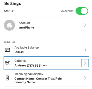 The second option down says Caller ID and displays the phone number that is currently active on your smrtPhone Mobile App.