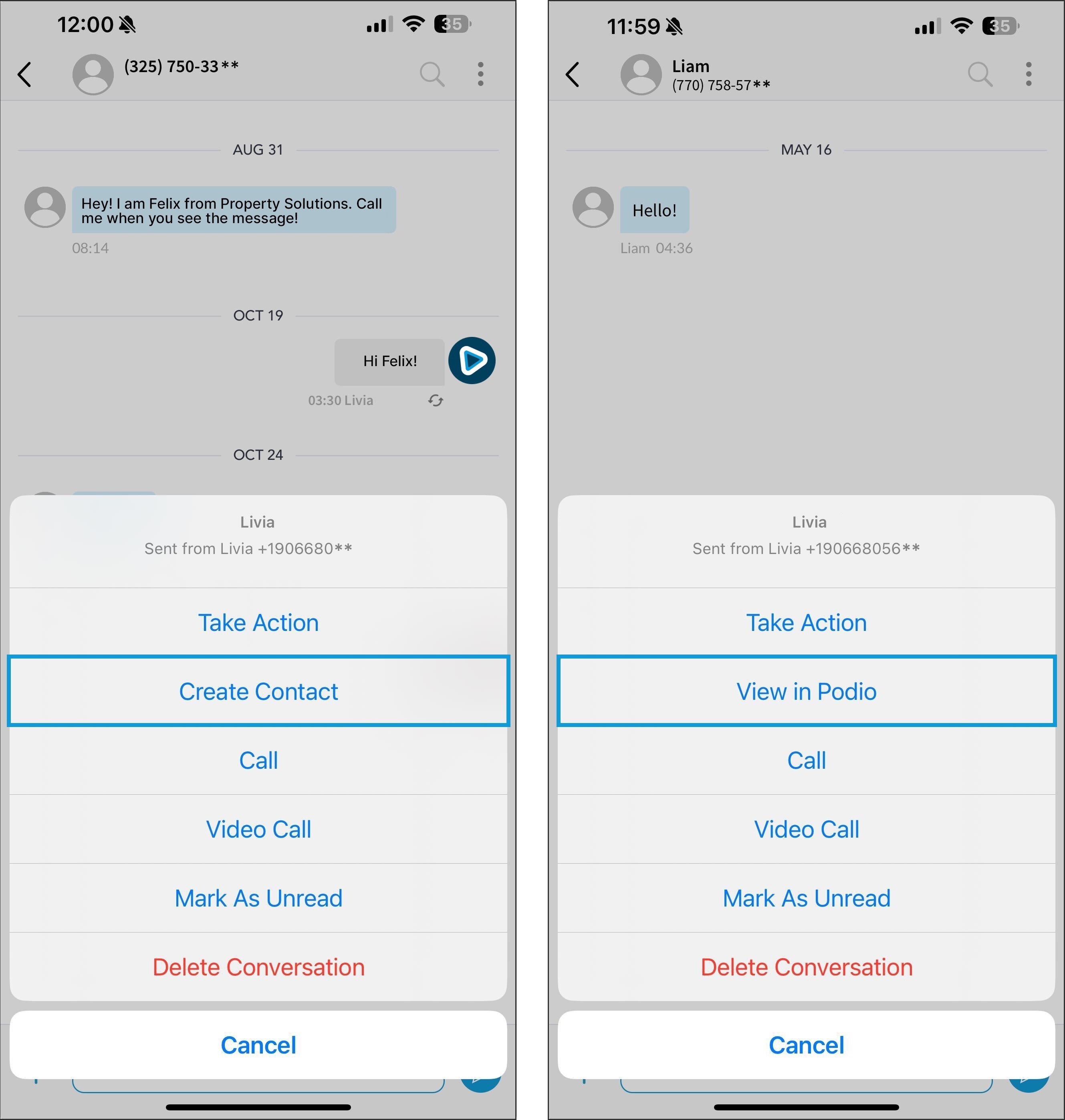 Create contact/lead - If the number is not in your Contacts App or View in your CRM