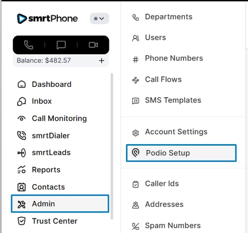 Podio users (who have appropriate user permissions in their smrtPhone account) and the Account Owner can customize settings related to the integration between smrtPhone and the CRM.