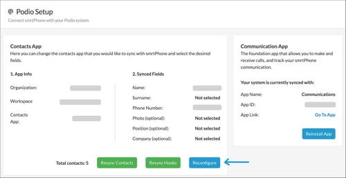 The Contacts App points to the app that holds all your contacts in Podio. To completely change the Contacts App, click Reconfigure in your Podio Setup page, and then you can choose the app that will be used from now on. You will have to map the appropriate fields (name, phone number, etc.) and then Apply Changes.