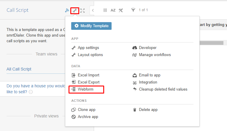 If you've received the following error when trying to access the Call Script in smrtDialer, head over to the workspace where you have your smrtDialer apps installed and clicking on the wrench icon to edit the webform options.