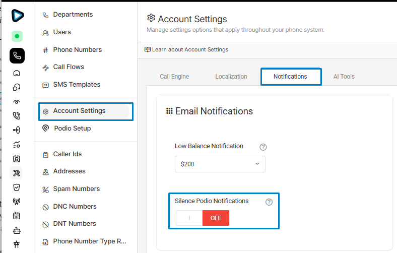 smrtPhone gives you the option to turn off the notifications directly from your smrtPhone account. All you need to do is to head over Admin > Account Settings > Silence Podio Notifications.