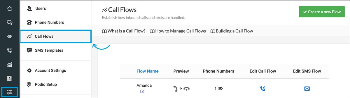 To reach the SMS flow editor, go to your Admin Dashboard > Call Flow tab and select Create SMS Flow (if you never created one) or click on the envelope icon to edit an existing flow.
