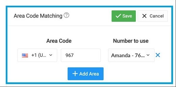 If you want to cover all area codes in a metro region using the same phone number, you must enter each area code and then the phone number you want to use. For example, in the Houston TX metro region, there are four area codes (281, 713, 832, and 346). If you wanted to use your user's Houston phone number starting with 713 for all of them, you must make four entries in the Area Code Matching area - one for each area code.