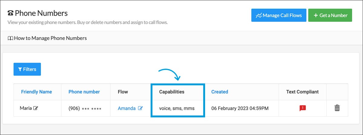 The first thing you need to do is make sure that the number you are working on has permission to receive and send SMS/MMS. You can do that by going to your Phone Numbers Admin page and checking the Capabilities of the numbers:
