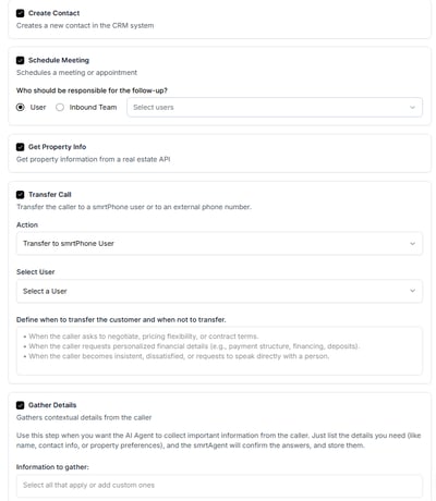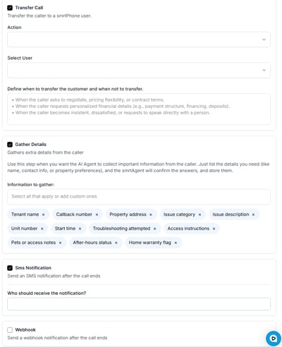 Gather Details - Specify to your smrtAgent which information is relevant to gather during the conversation. You can choose from the default available or create custom ones