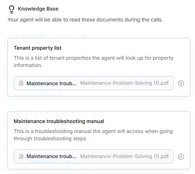 Use the Knowledge Base to provide documents that are useful during a conversation, such as a property list or a troubleshooting manual you already have. Please follow the required format to ensure accurate responses.