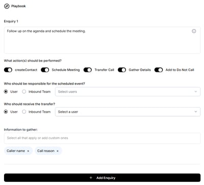 This agent’s Playbook is designed to mirror a professional receptionist, based on user context. They can act on up to 10 enquiries you configure, each with multiple actions.