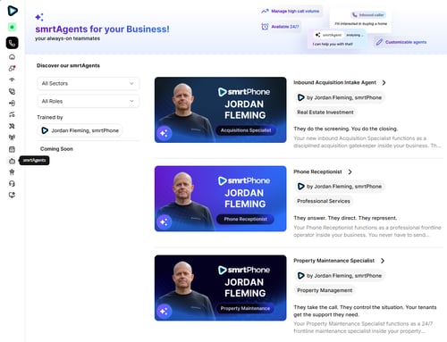 Go to Admin Dashboard > smrtAgents. Currently, smrtPhone offers three agents: