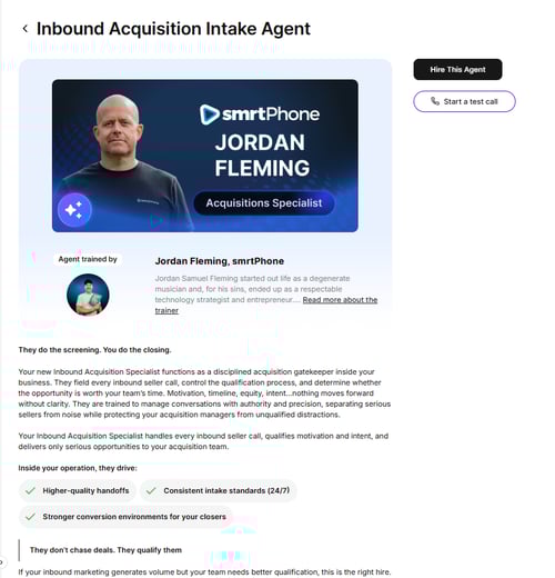 Inbound Acquisition Intake Agent – Handles inbound seller calls, collects key information naturally and without pressure, qualifies the seller, and routes the call to the right next step.