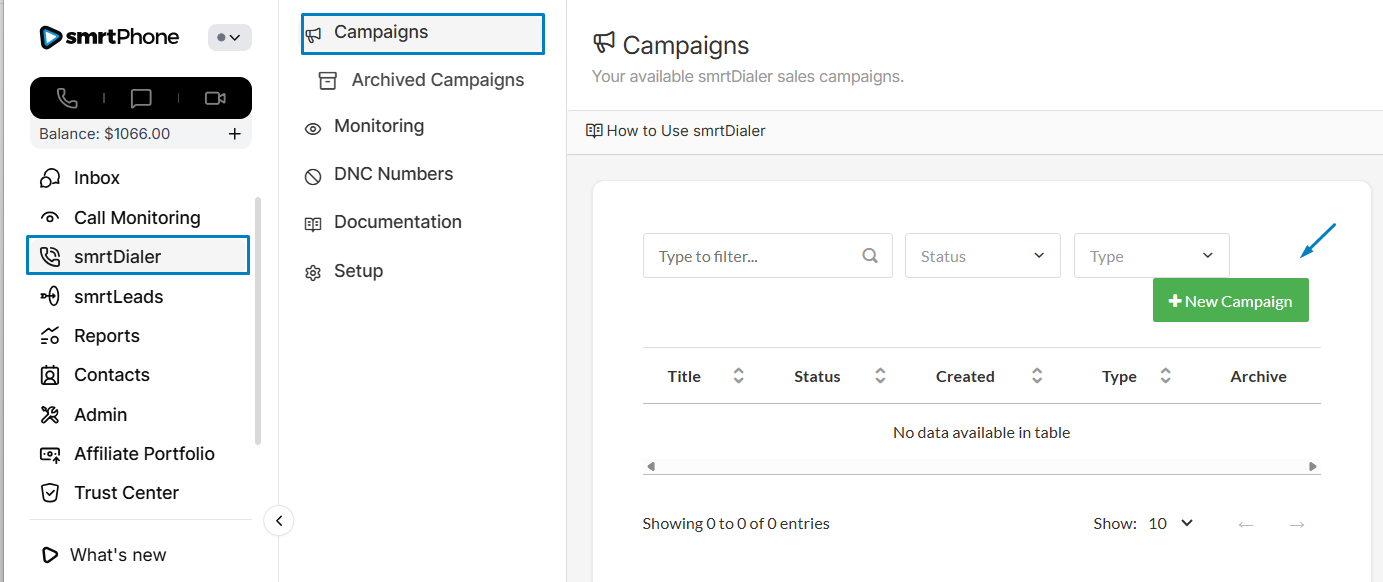 Hit the โ New Campaign button in the upper right of your smrtDialer.
