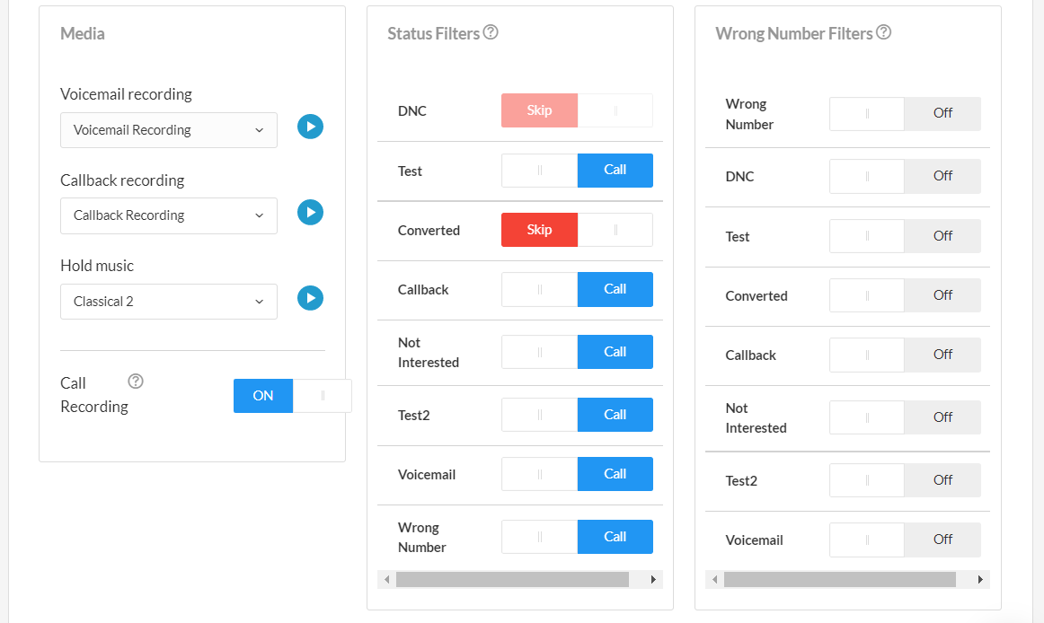 Non-qualified lead - This is where Call Statuses / Filters are useful. On the right side of the Call Engine tab you need to Set Filters. These are your call statuses that will determine what happens to each prospect in the campaign, based on the statuses your agents use to finalize the calls. (No answer, wrong number, DNC, etc.)
