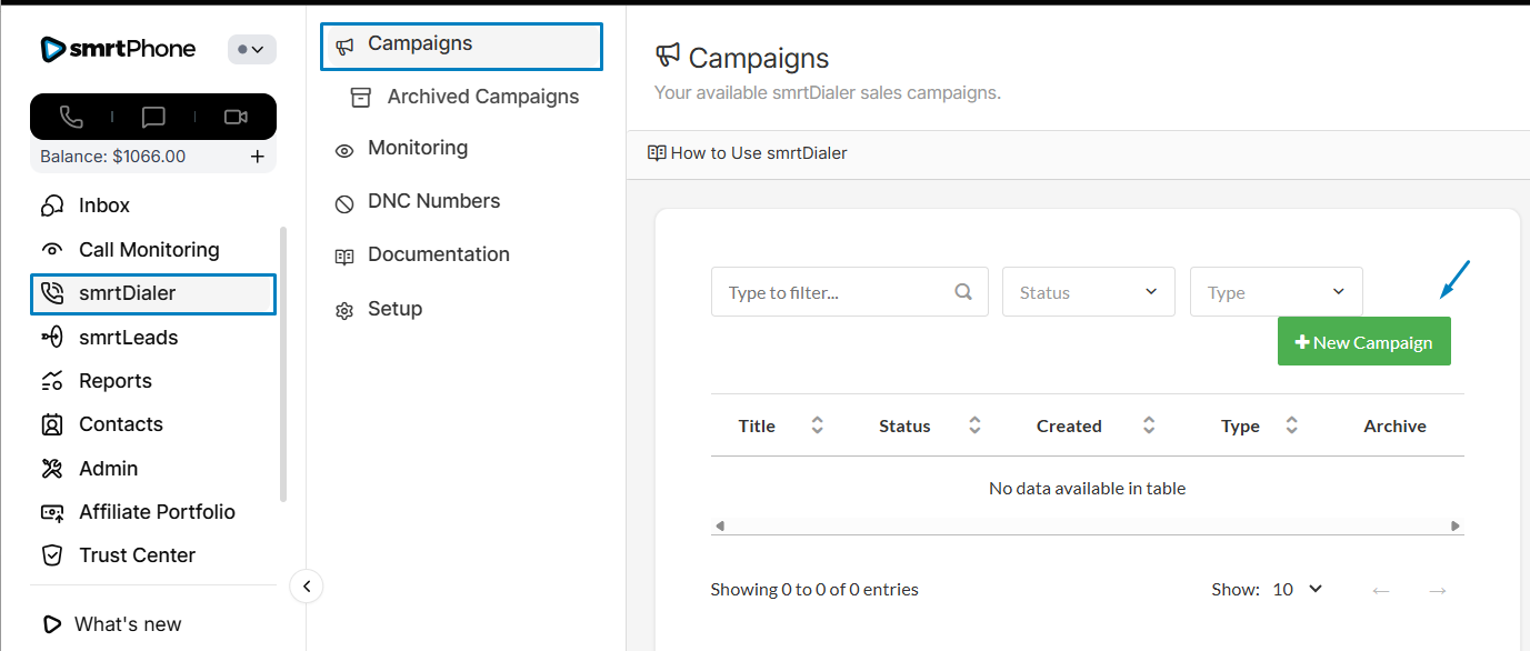 Head to smrtDialer from your smrtPhone Dashboard (๐ icon in the left navigation) and select the +New Campaign button in the upper right corner.