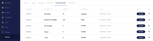 Within the Activity tab, you can find all the current campaigns of the Predictive dialer / Integrations (smrtDialer) and their status.