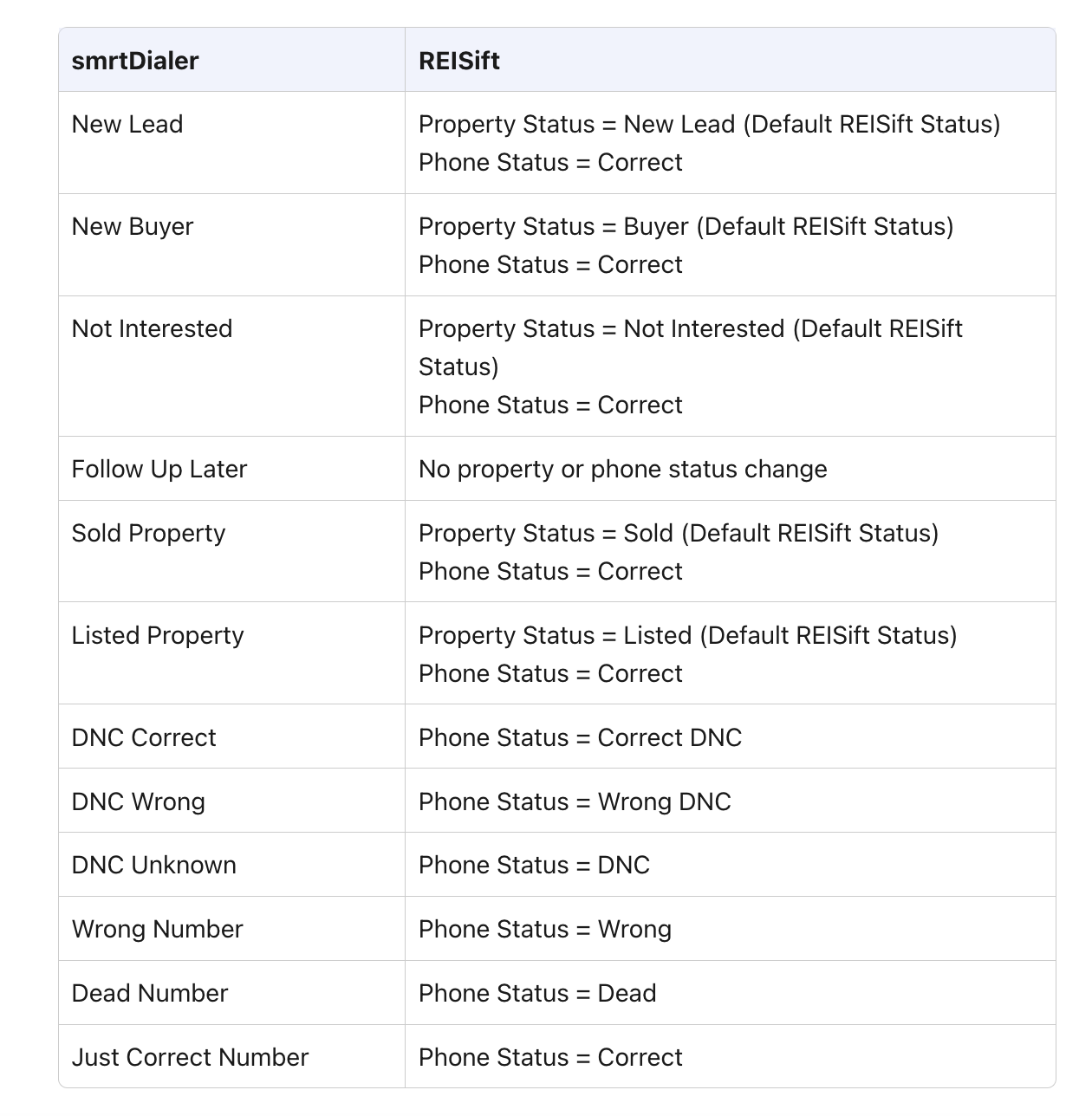 REISift Users cannot customize their smrtDialer Call Statuses from within the smrtPhone page. You will use the default REISift Call Statuses available for you in your CRM.