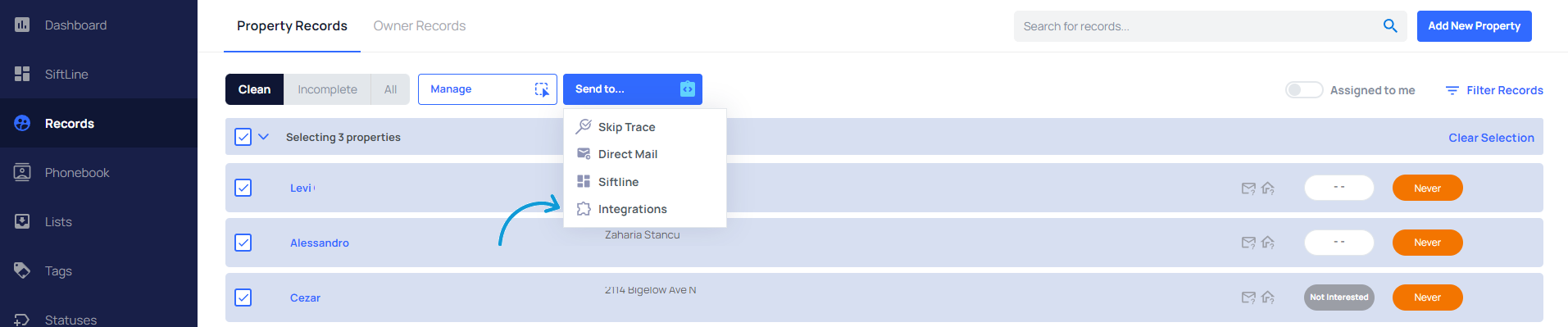 Select all records that you want to include, click the action button - ๐ผ icon and select Integrations.