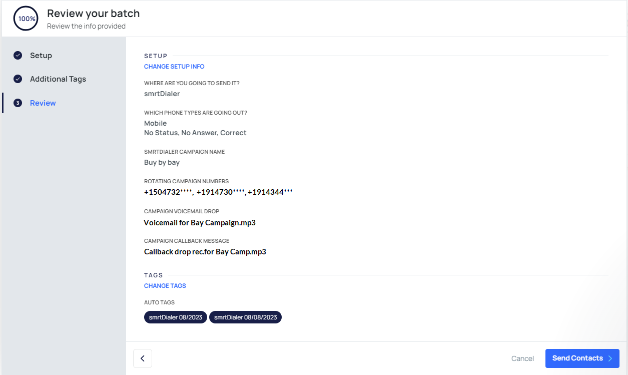 Press the Review button and check if all the information complies with your settings. If not, hit Cancel and edit what you need again. If yes, hit Send Contacts.