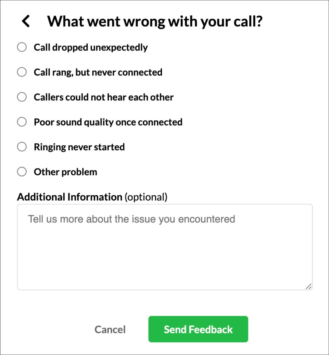 You can choose from the options provided and give additional information about the issue you encountered with your call. Your feedback will help our team to improve the system to offer the best experience for you!
