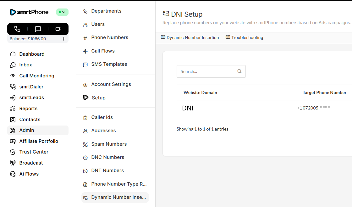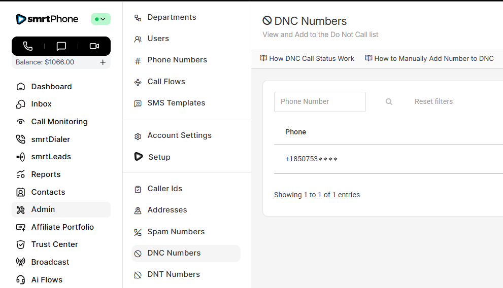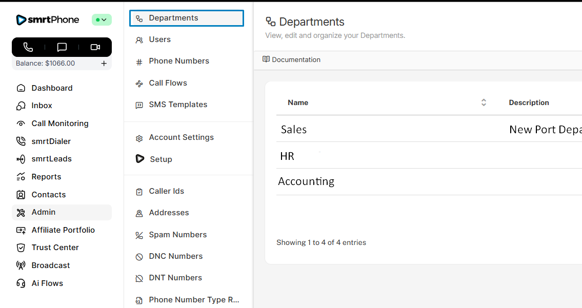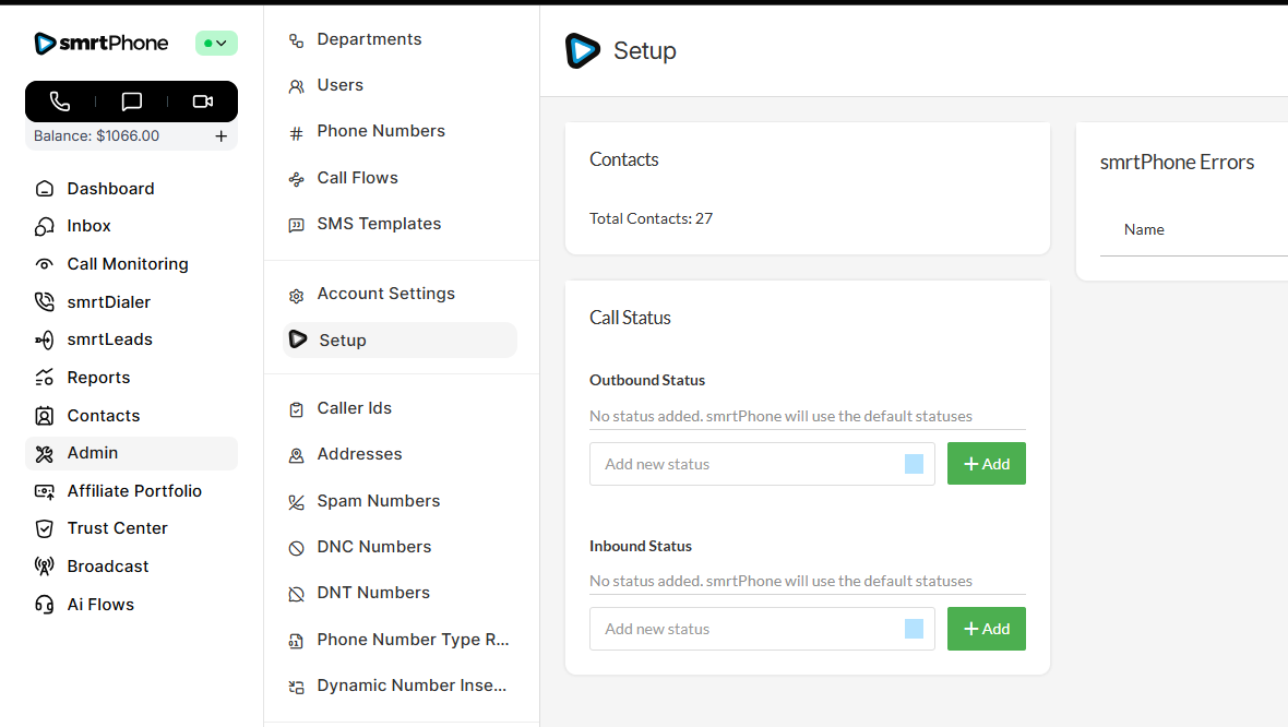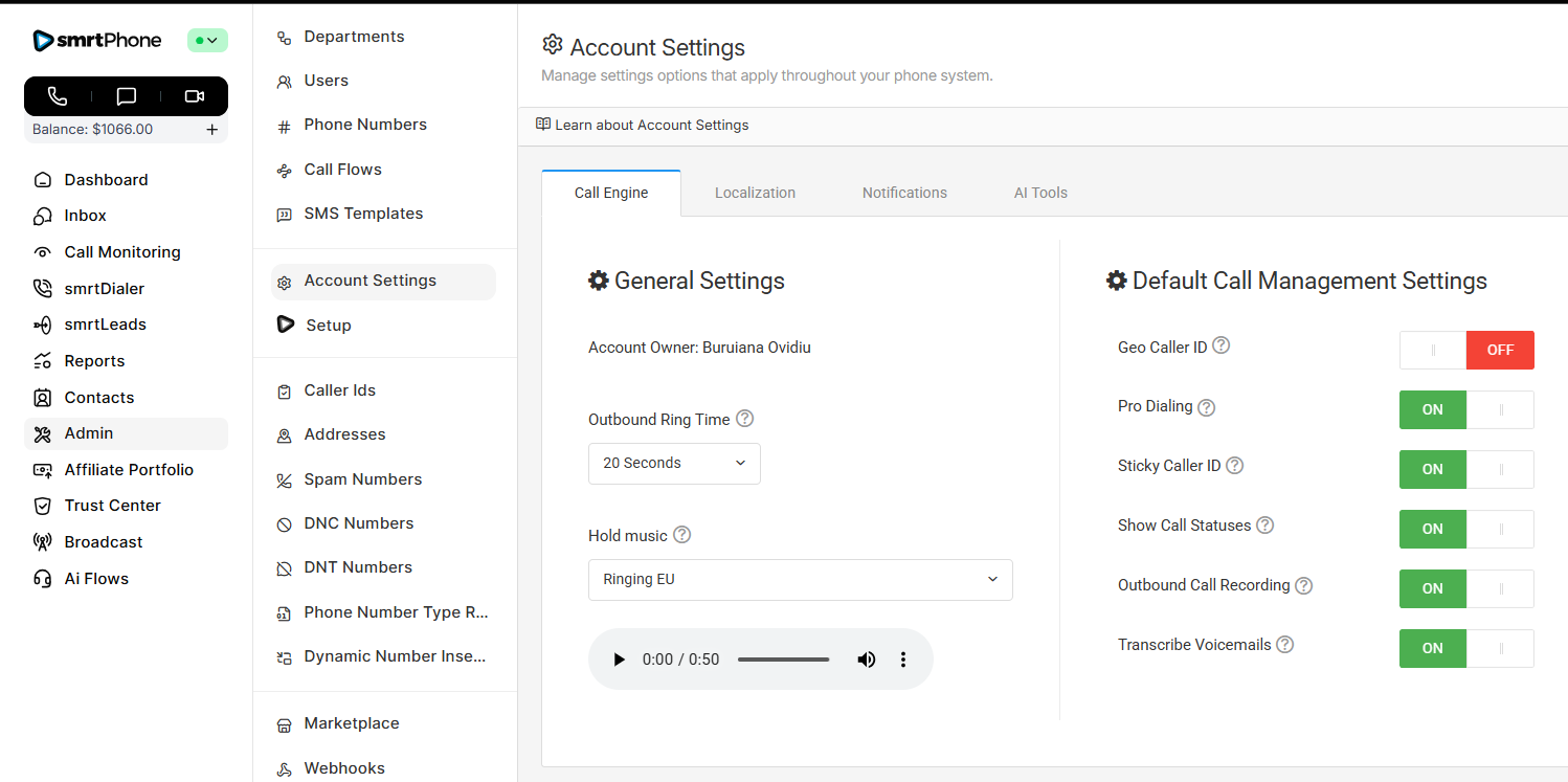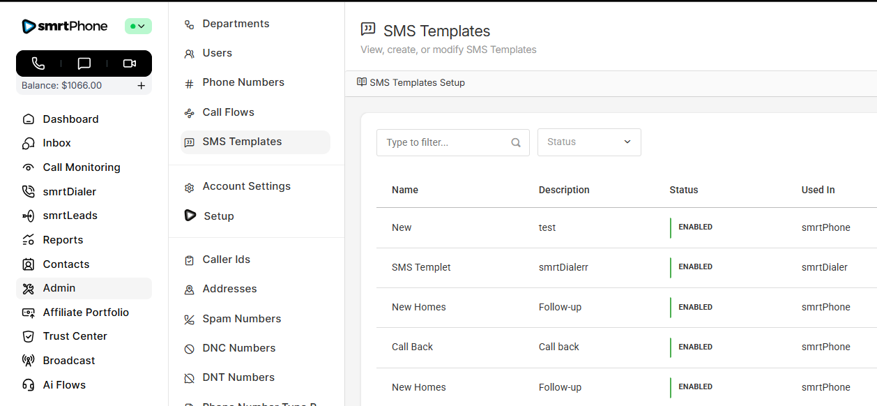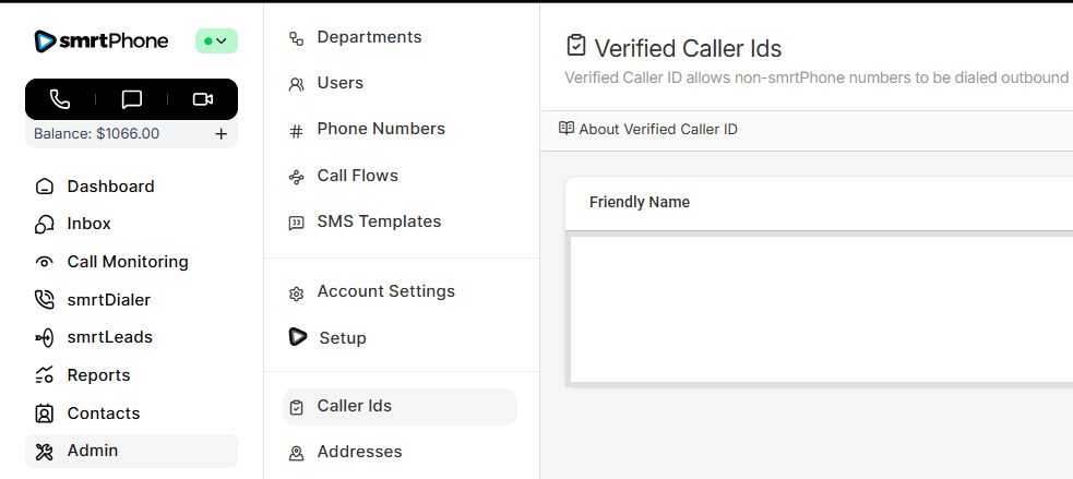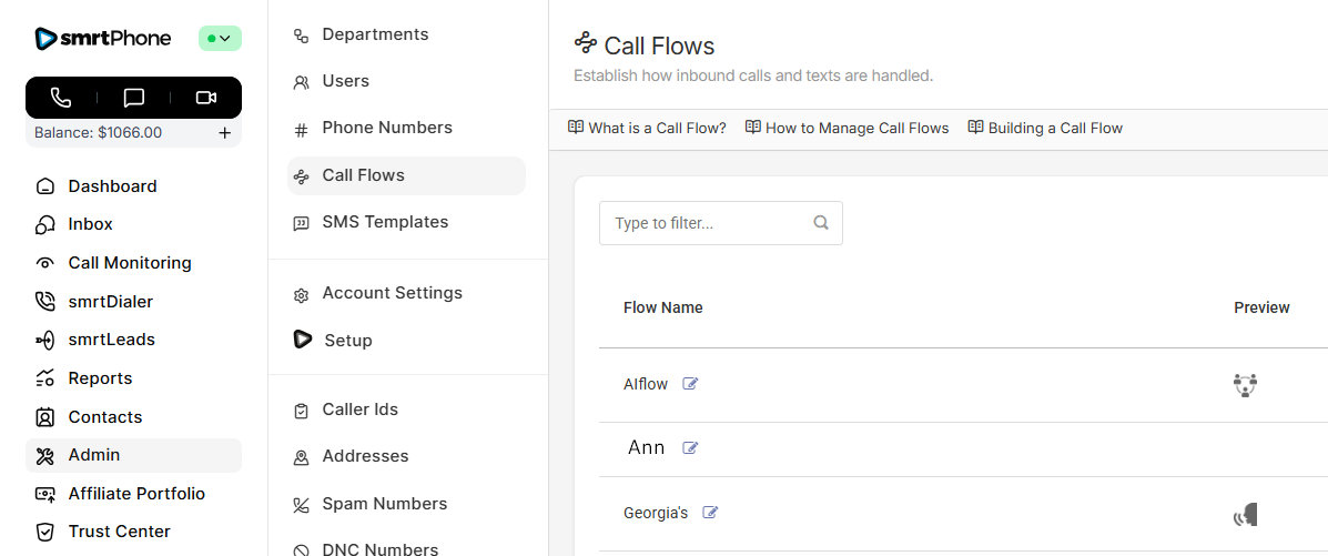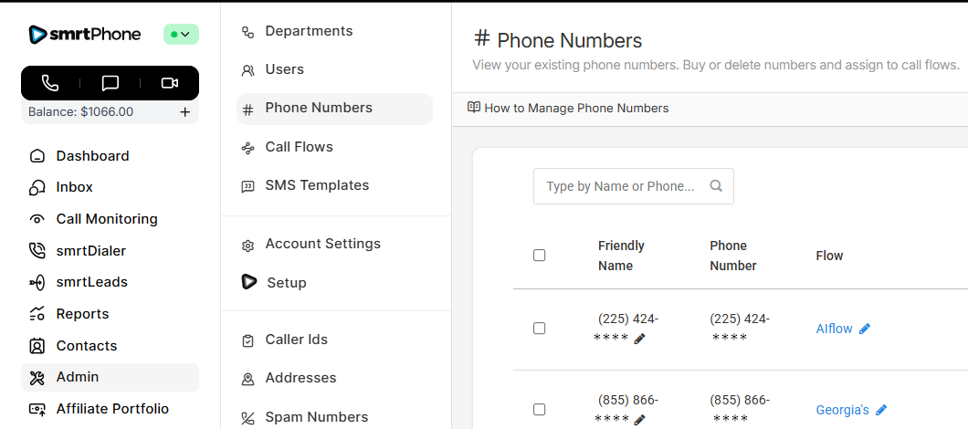 Manage all phone numbers in your account. In this section, you can buy new numbers and delete ones you no longer want. You can also control which inbound Call Flow each number will ring. (A single number can only ring to one Call Flow created in smrtPhone. One set Call Flow in smrtPhone can be used for many numbers.)