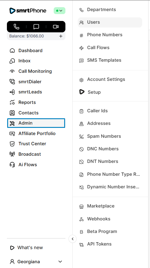 This article shows you a core overview of the Admin Dashboard: smrtPhone Dashboard > Admin Menu (≡).