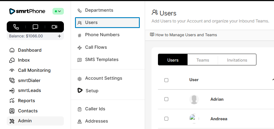 Where you control who has access to your smrtPhone system. Add/Delete Users and create Teams (e.g. Sales Team or Customer Support) for easier inbound call flow setup.