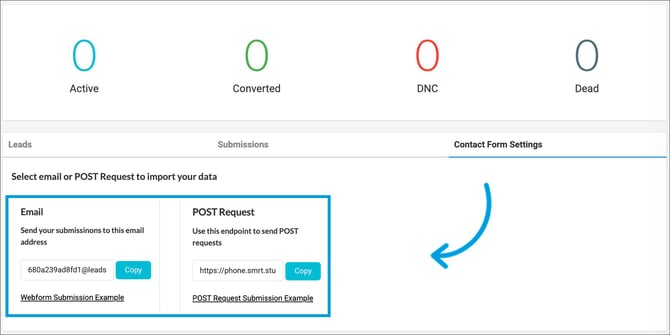 From the Source Overview screen, click on the Contact Form Settings tab. Here, you will be able to see the email and POST Request endpoint data that is unique to this Source. Each address is unique and specific for that particular source.