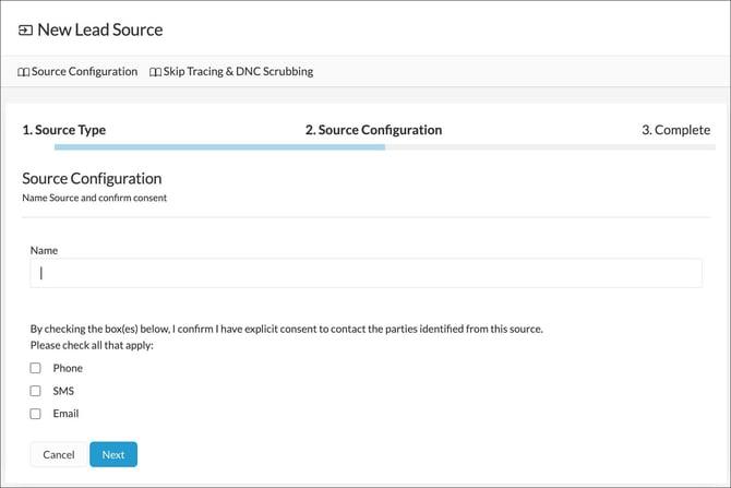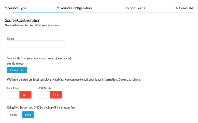 Select whether you'd like to Skip Trace or perform scrubbing against the National Do Not Call Registry for this list. Note that using these list cleaning features will incur usage fees (based on the number of leads) and be deducted from your credit balance. You can also perform these data cleansing actions after the upload, from the Source Overview page.