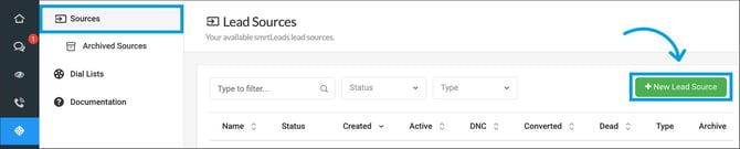 To create a new source, go to smrtLeads > Lead Sources and click the green +New Lead Source button.