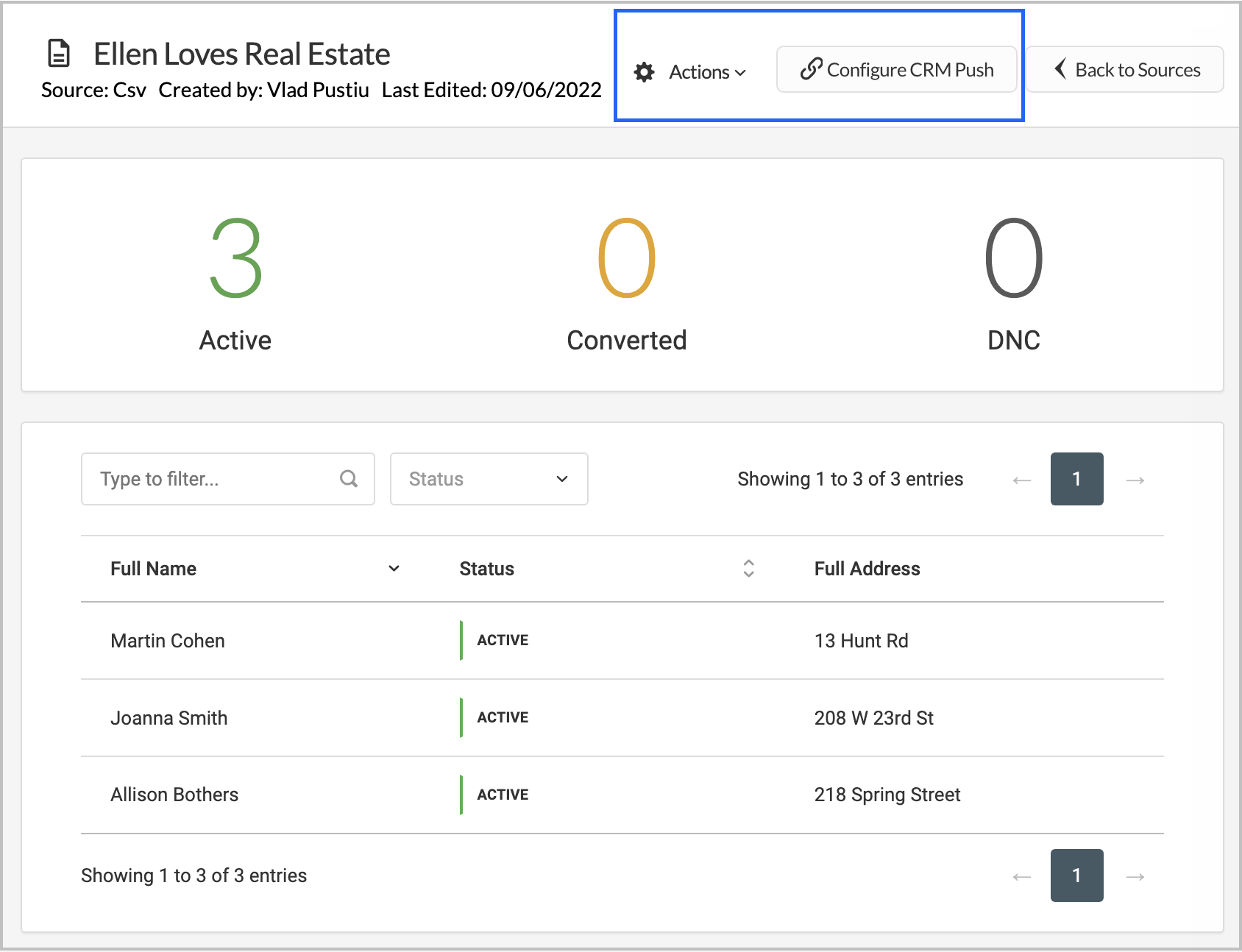 From this page, you can see the name, type of source, who created it, when it was last edited, the number of active/converted/DNC leads, and an overview of the leads within this source. You also have the option for further configuration from here.