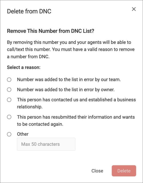 To delete a contact from DNC, select a valid reason, and then you can press the Delete button.