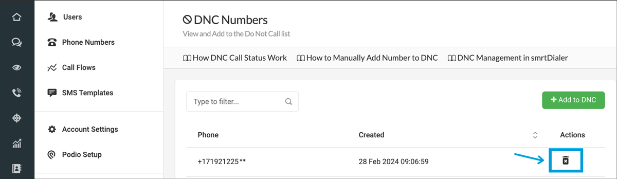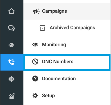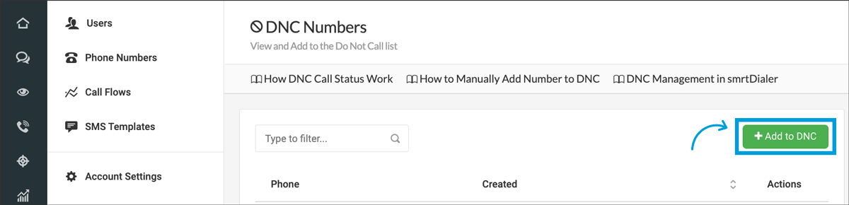 This option can also be reached from smrtPhone Page > Dashboard > Admin, then selecting DNC Numbers.