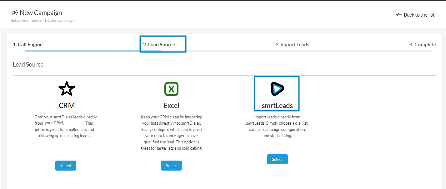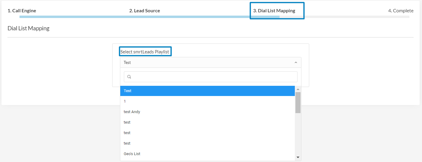 Select the smrtLeads option to grab your leads from the newly created Dial Lists.